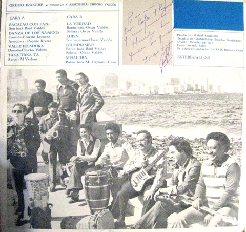 The 8 tracks were reissued on the CD La colección, Vol. 1, and on multiple compilations and foreign vinyl reissues. In our Roots of Timba section we review our two favorite tracks: Bacalao con pan and Quindiambo. The latter, paired with La verdad, appears on one of the few 45s we've been able to find by Irakere. Oddly, another, 6902, pairs the La verdad with Valle de la picadura. the only other single we know of was 7529, from about 1982, with Los caramelos and Que se sepa yo soy do la habana. There must be more singles and EPs out there, and if you know of one, please send an email! We're also very interested in confirming that the 45s have the same recordings as the LP. We think the do, but around that time, Los Van Van made a habit or doing separate recording sessions for their singles and albums.