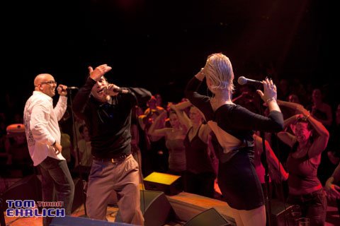 Danny Lozada and his 11 piece band treated a large crowd at Yoshi's Oakland on November 25, 2009 with two sets of sizzling timba. Danny is truly one of the great performers in Cuban music. Haifa Arango on coro came with Danny (both live in Florida and Mexico), Gustavo Ramírez on piano came up from Los Angeles fo the gig and the rest of the band are some of the best Afro-Caribbean musicians in Northern California including Carlos Caro on congas, Omar Ledezma coro and percussion, Yanill Nario on bass, Colin Douglas on drum set, Patricio Angulo on timbales, Coto Pincheira on teclado and Roberto Morris and Julius Meléndez on trumpets. Here's some photos from the sound check and concert.