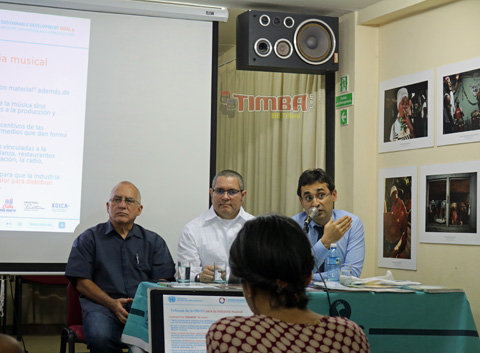 ENGLISH: One of the features that makes Cubadisco truly special is that there is always an academic symposium associated with the event (yours truly has presented there in the past regarding Cuba and the GRAMMY awards). .This event is directed by the Center for the Research and Development of Cuban Music (CIDMUC). This is always a combination of musicology lectures, demonstrations, roundtables and presentations related to the music industry in music. This year there were several presentations related to Nueva Trova (the theme of this year's Cubadisco) and an increased emphasis on developments in Cuba's music industry due to some interesting recent developments. For this writer, some of the most fascinating sessions were presentations about La Trovuntivitis, part of the Nueva Trova movement bases in Santa Clara; an intriguing device developed in Cuba for the restoration of old audio tapes; Primera Linea; a proposal to develop "Music Cities" in Cuba and a joint plan by the United Nations Industrial Development Organization (UNIDO), the Ministry of Culture and KOICA (the Korea International Cooperation Agency) to help accelerate the commercialization, distribution and awareness of all of Cuba's music. I went to the trouble to include some photos of some of the slides from that presentation because it is worth noting that the conversation does involve the entire island and not just Havana and Santiago; furthermore, there is a message in this exercise to those North American policymakers who believe that putting the brakes on engagement can be used to leverage policies in Cuba - Cuba will proceed to develop its music industry (more on this in later articles) with or without the involvement of the United States. If the US chooses to stay out of this process for policy reasons, once it is ready to engage, it may find that the best seats at the table are already taken by others.