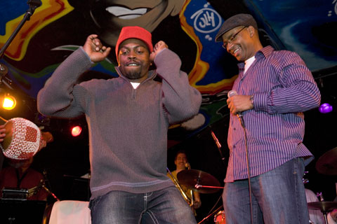 Horn section in back includes Melecio Magdaluyo on sax, Jeff Lewis on trumpet and Jeff Cressman on trombone