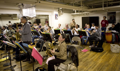 During my recent visit to New York City, I attended numerous musical events, but some of my most enjoyable times were when I had the opportunity to hang out with Louie Bauzó at the Harbor Conservatory and attend two big band rehersals and one Afro-Cuban dance class. Mr. Bauzó insisted on perfection when working with the big band and the drummers for the dance class and knows how to get the most out of the musicians he directs. It is clear that Louie is motivated by his love of Afro-Caribbean music, not by the desire to be famous or rich. During the short time I spent with him, I have come to like and respect him very much. I also had the opportunity to meet Louie's very talented and beautiful daughter, Liza Bauzó, and see her practice with the big band. I'm certain we will be hearing a lot from her in the future. Liza currently performs with Grupo Caribe as well as the Harbor Conservatory Big Band. She also sings on Grupo Caribe's latest cd "Somos Caribeños". What follows is a photo report of the two big band rehersal I attended. There will also be a separate photo report on the Afro-Cuban dance class I also attended.