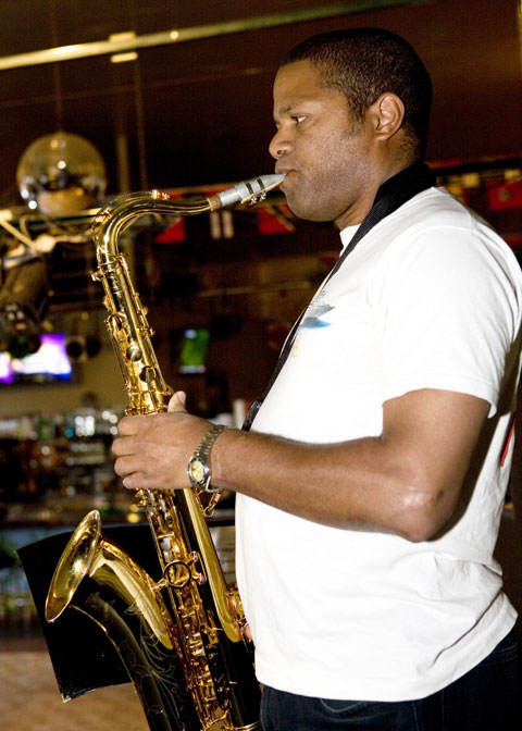 Evelio Roque on sax, Chris Barnes on trumpet, Jeff Lewis trumpet, Matt Lucas on congas